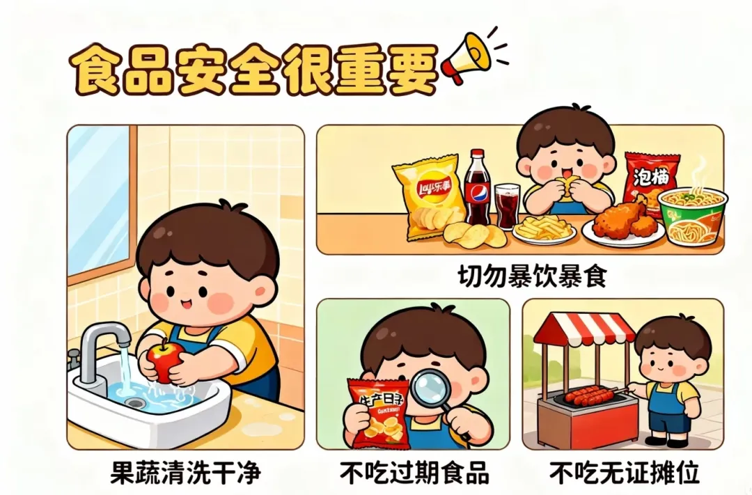2.教育孩子不购买、不食用街头摊贩无卫生保障的零食,拒绝 “三无” 食品、过期变质食品;外出就餐或祭扫后用餐,优先选择证照齐全、卫生状况良好的正规餐厅,确保饮食安全。