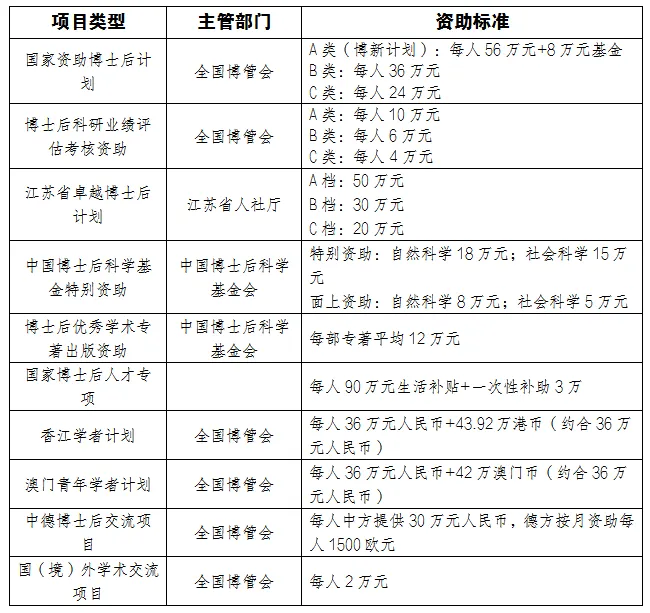 在站期间同时获得国家或者地方博士后人才项目支持,则在原薪酬基础之上叠加国家或者地方项目待遇。如入选江苏省卓越博士后计划,将分两年获得省财政生活资助20-50万元(学校待遇可叠加),具体可参见《江苏省卓越博士后计划实施办法》。鼓励参加澳门青年学者、香江学者、国家博士后人才专项等海(境)外博士后人才项目申请(团队已有1名博士后成功获批),项目经费与学校薪酬叠加发放。特别优秀者各类资助叠加年薪可达百万元。目前本团队博士后已分别获得香江学者奖励(已留校,晋升为教授)以及江苏省卓越博士后计划(额外资助30万)。