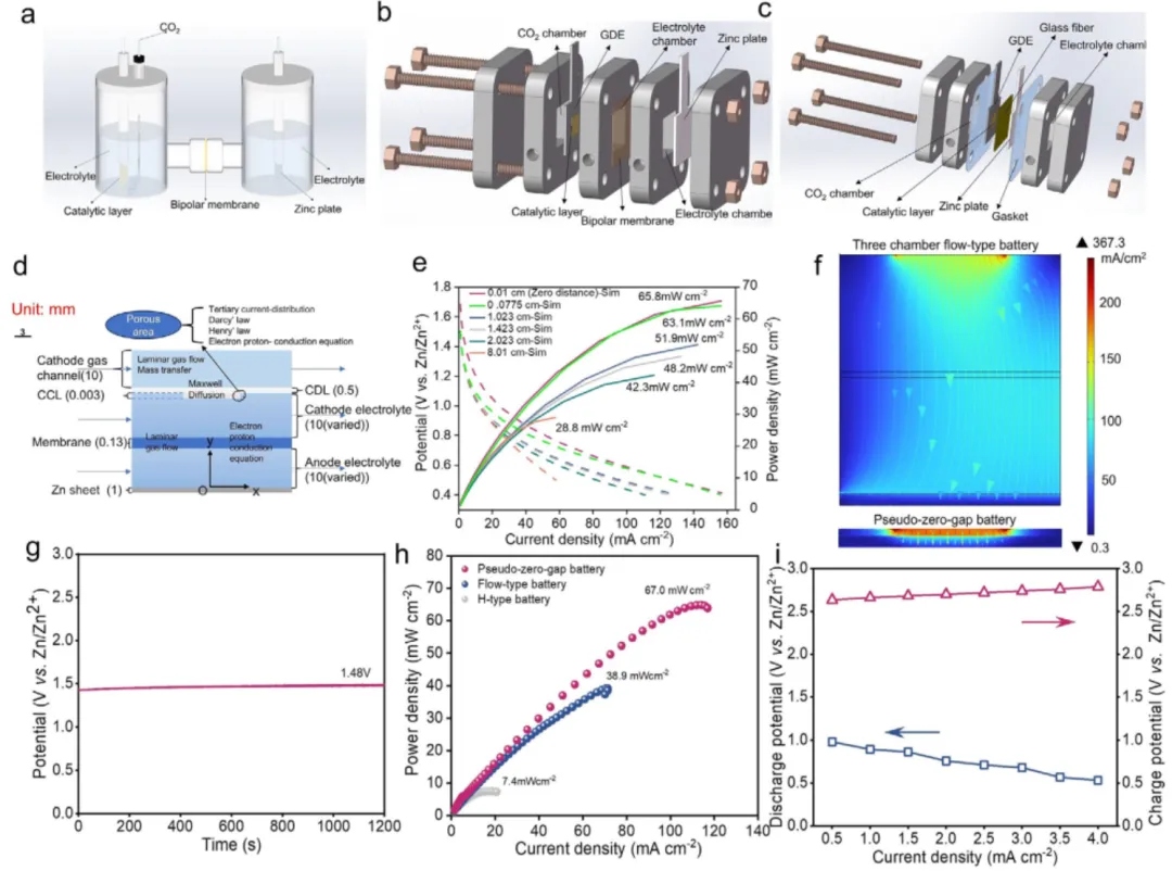 图2.(a)H型AZCB;(b)三室流动型AZCB;(c)准零间隙AZCB;(d)AZCBs的2D建模配置;(e)具有不同电极间间隙的AZCB的实验和模拟I-V和I-P曲线;(f)准零间隙电池(底部)和流动型电池(顶部)的电解液中的电流和电流密度分布;(g)准零间隙AZCB的OCP。负极电解液为6M KOH +0.02M Zn(ac)2,正极电解液为6M KOH。(h)使用相同正极材料的不同AZCB的J-P曲线;(i)准零间隙AZCB的连续充电和放电曲线。