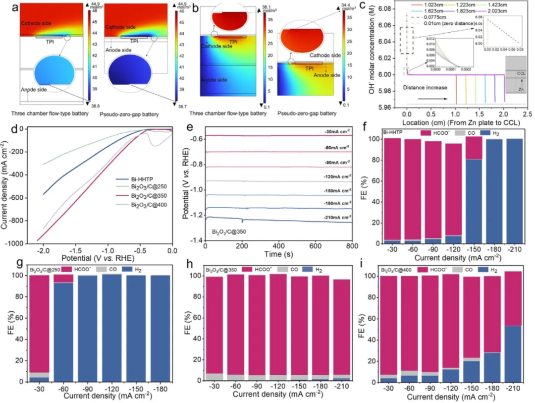 图3.(a) 气室中气态CO2的摩尔浓度分数;(b) 当极间距离为2.023 cm(左)和0(右)时,AZCBs在TPI侧与负极侧的溶解CO2摩尔浓度(相对于Zn/Zn2+为0.4 V);(c) 不同极间距离下AZCB沿中心线的OH-离子分布;(d) 使用不同电催化剂的半电eCO2RR的线性扫描伏安(LSV)曲线;(e) 使用Bi2O3/C@350催化剂的eCO2RR在不同电流密度下的计时电流法测试结果;(f-i) Bi-HHTP、Bi2O3/C@250、Bi2O3/C@350、Bi2O3/C@400催化剂促进eCO2RR产物的法拉第效率(FE)值。