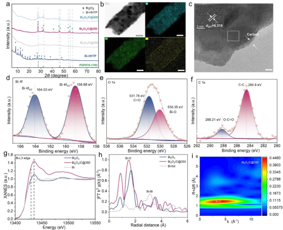 图4.(a) 电催化剂XRD图谱;(b) Bi2O3/C@350的TEM图像及其Bi、O、C元素的能量色EDS图;(c) Bi2O3/C@350的HRTEM图;(d–f) Bi2O3/C@350的Bi 4f、O 1s和C 1s的 XPS光谱;(g) Bi2O3/C@350、Bi2O3及Bi箔参比样的Bi L3边的XANES谱;(h) Bi2O3/C@350、Bi2O3及Bi箔参比样的Bi L3边R空间谱;(i) Bi2O3/C@350的Bi L3边小波变换谱。