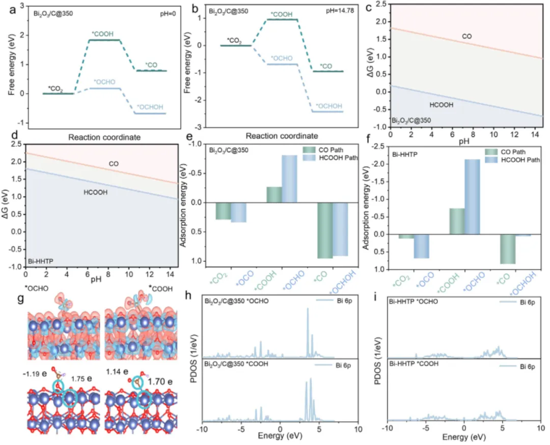 图5.(a,b) 使用Bi2O3/C@350催化剂时,eCO2RR在pH=0和14.78介质中生成CO和HCOOH路径的自由能图;(c-d) Bi2O3/C@350与Bi-HHTP的eCO2RR选择性Pourbaix图;(e,f) Bi2O3/C@350与Bi-HTTP的COOH和OCHO中间体吸附能;(g) Bi2O3/C@350的OCHO与COOH中间体差分电荷密度及Bader电荷分析;(h,i) Bi2O3/C@350与Bi-HTTP的Bi 6p轨道投影态密度(PDOS)。