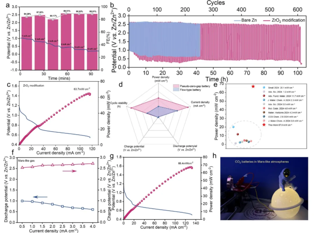 创新性的提出了一种准零间隙AZCBs体系,该体系不仅利用气体扩散正极(GDE)促进CO2扩散,而且通过减小负极和正极之间的距离来降低传质阻力,所制备的AZCB表现出优异的放电性能。使其在117.5 mAh cm-2的电流密度下实现了67.0 mW cm-2的峰值功率密度。并且AZCB在模拟火星大气中的出色性能表明,它可能是在极端环境下同步能量生成与原料生产的潜在解决方案。
