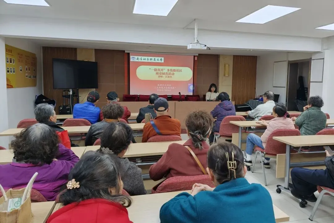 活动中,江加贝博士以深厚的专业素养,为居民细致普及南京绒花的悠久历史与独特艺术价值。作为江苏省非物质文化遗产,南京绒花始于唐代、盛于明清,谐音“荣华”,寓意吉祥富贵,从宫廷贡品走入民间生活,承载着深厚的文化底蕴与东方审美。江博士结合实物与案例,深入浅出讲解绒花的工艺特色、文化内涵与传承意义,让居民全方位领略这门传统技艺的独特魅力,零距离触摸非遗文脉。