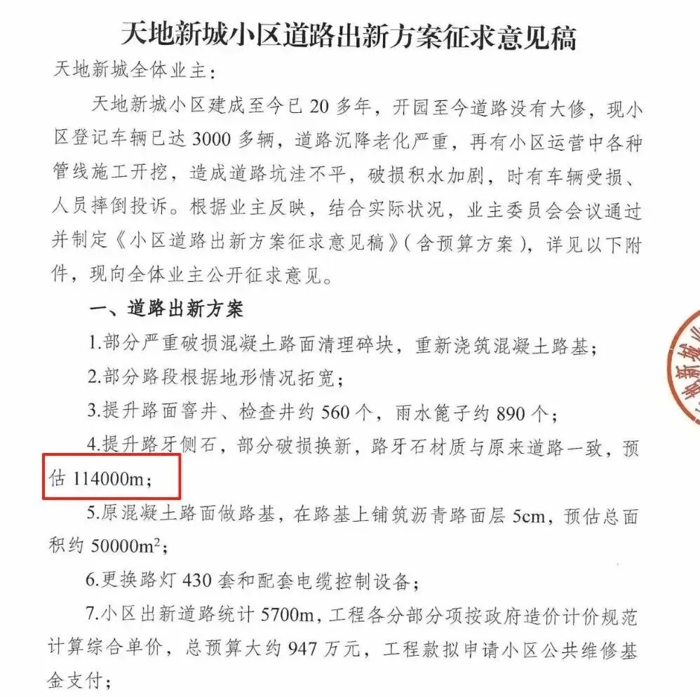 天地新城业委会拿出一份小区道路出新方案征求意见稿,计划动用947万元维修资金,在小区内部修路。方案中有模有样写着:道路出新总长度5.7公里。但后面跟了个统计——小区内部道路维修统计出114公里。
