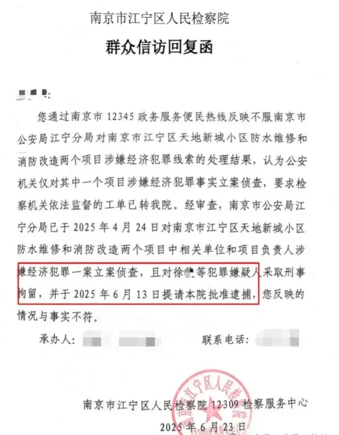 4月到5月,江宁公安分局正式立案。6月,原业委会主任徐某、施工单位负责人郭某被批捕。