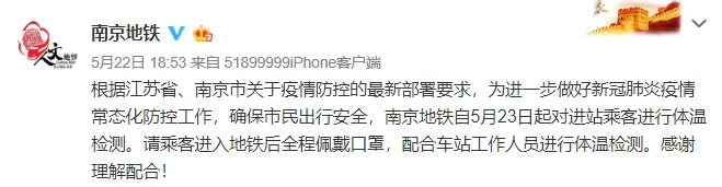 据@南京地铁 消息:根据江苏省、南京市关于疫情防控的最新部署要求,为进一步做好新冠肺炎疫情常态化防控工作,确保市民出行安全,南京地铁自5月23日起对进站乘客进行体温检测。请乘客进入地铁后全程佩戴口罩,配合车站工作人员进行体温检测。感谢理解配合!