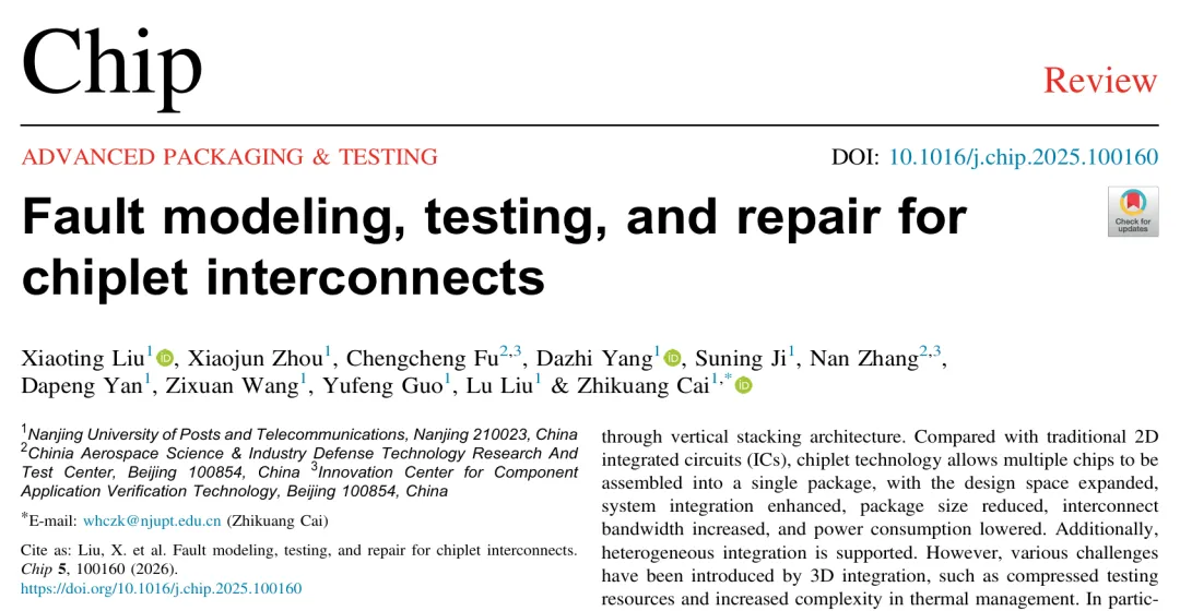 1. Liu, X. et al. Fault modeling, testing, and repair for chiplet interconnects. Chip5, 100160 (2026).
