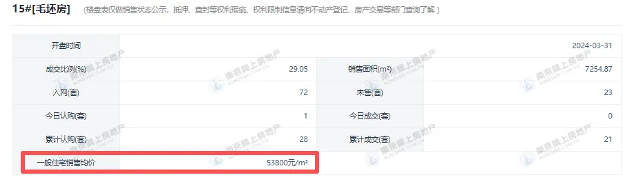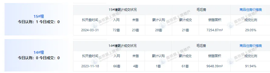网上房地产显示,14、15号楼分别在2023年11月、2024年3月上市,共138套房源,当时均价约5.38万/㎡。