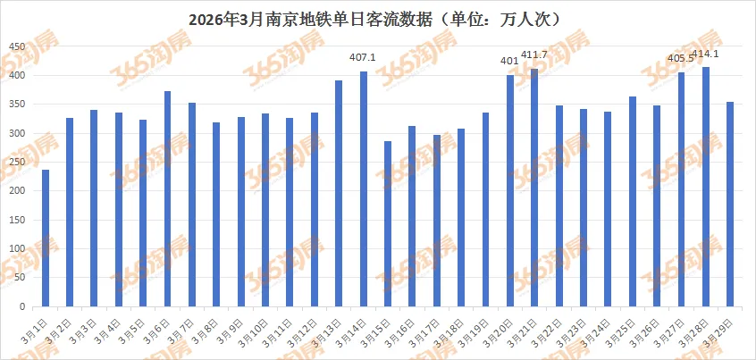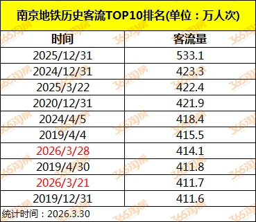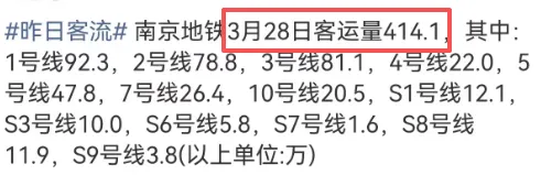 数据显示:3月28日(周六),南京地铁客流量高达414.1万人次,创下了今年以来单日最高值。