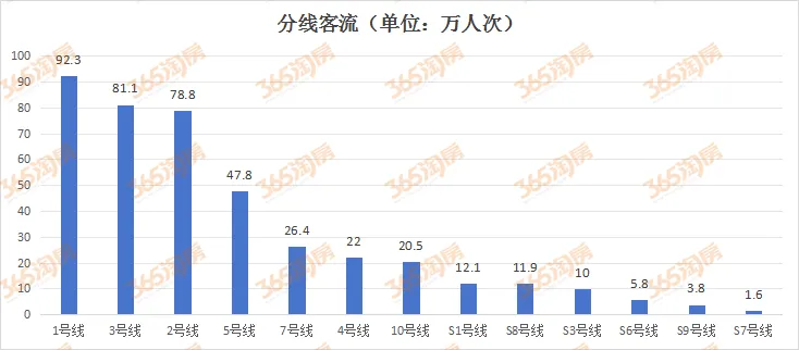 排名前五的分别是:1号线92.3万,3号线81.1万,2号线78.8万,5号线47.8万,7号线26.4万。