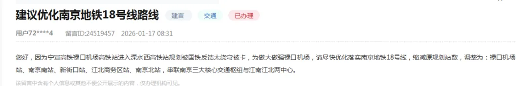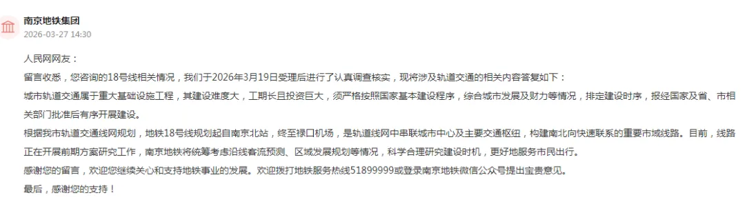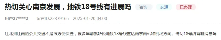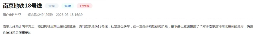 作为南京目前唯一一条已批复,但是未开建的地铁线,18号线的进展同样备受关注。今年开年,有网友在领导留言板上建言——缩减原规划站数,尽快优化落实南京地铁18号线。刚刚,我看到又有网友建议18号线提速启动。