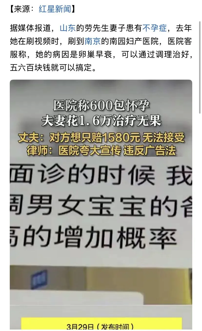 >南京一医院宣传600元包怀孕,夫妻花1.6万无果,院方仅同意赔偿1580元