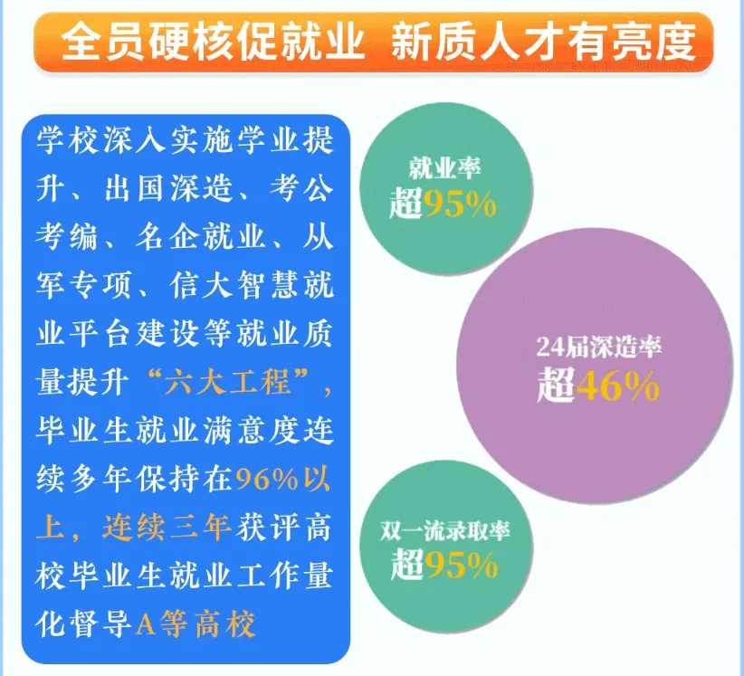 南信大近年升学率保持在45%-50%间,境内升学率占比38%左右,近90%深造者去往知名双一流高校及科研院所,尤其是大气科学专业毕业生,升学率超50%。