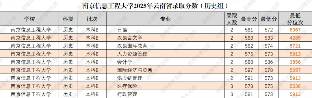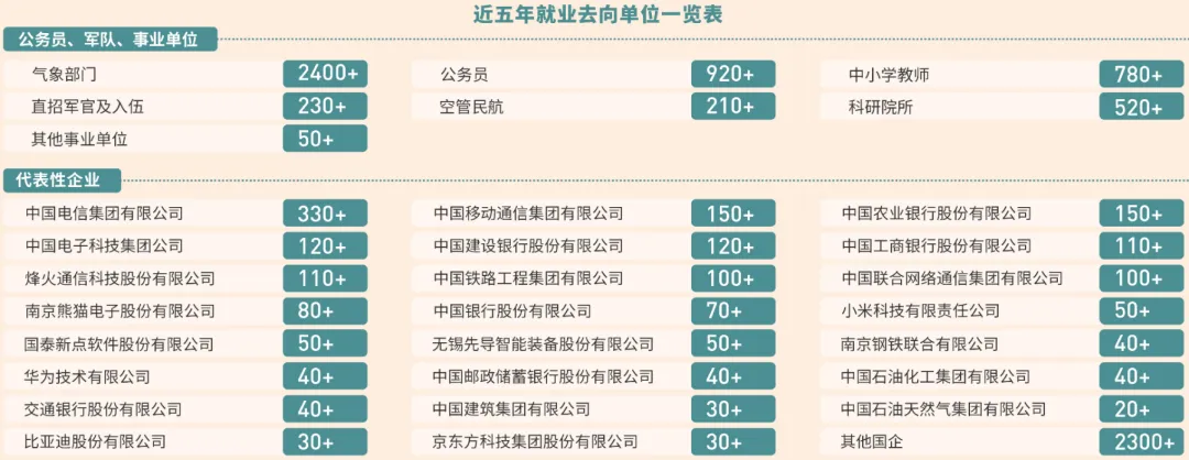 南信大的就业质量核心是“行业认可度高、薪资稳定”,学校2024届毕业生就业率95.6%,向全国气象部门输送了近600毕业生,向航空空管部门输送40多人。大气科学及相关专业作为学校的核心优势领域,就业率超98%,70%以上进入国家气象系统、航天航空、能源企业,比如中国气象局各省市分局、中国航天科技集团(卫星气象监测)、国家能源集团(风电/光伏气象评估);同时像计算机科学与技术、电子信息等工科专业,多去往中国电信、中国电子科技集团、华为等科技企业的高薪技术岗位,而环境科学与工程、遥感科学与技术等交叉学科专业深受环保、测绘、新能源等领域的认可。历史组: