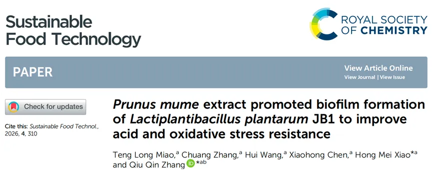 近期,南京农业大学三亚研究院食品科学技术学院张秋勤副教授团队在英国皇家化学会期刊《Sustainable Food Technology》(JCR一区, IF=5.3)上发表题为“Prunus mume extract promoted biofilm formation of LactiplantibacillusplantarumJB1 to improve acid and oxidative stress resistance”的研究性论文。2022级硕士研究生缪腾龙为论文的第一作者,张秋勤副教授为通讯作者。本研究以青梅提取物为例,证实天然酸性植物原料可通过LuxS/AI-2群体感应通路诱导植物乳植杆菌形成生物膜,增强其酸胁迫和氧化胁迫的耐受能力。本研究为植物源活性成分在益生菌稳态调控中的应用提供了新依据,也为绿色、低能耗益生菌处理技术的开发提供了新路径。