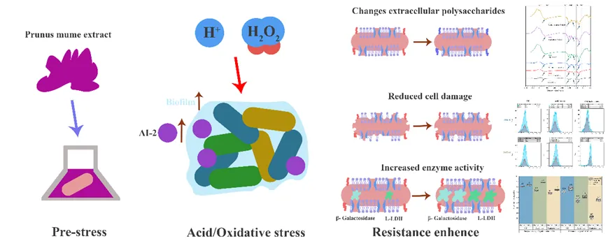 青梅提取物(PME)是一种富含抗氧化物质的青梅加工产物,是可持续微生物工程领域中具有巨大未开发潜力的可再生资源的典范。尽管已有研究表明青梅提取物具有多种生物学活性,但其是否能够作为天然调控剂提升益生菌抗逆性、是否通过促进生物膜形成发挥作用,仍缺乏系统研究。