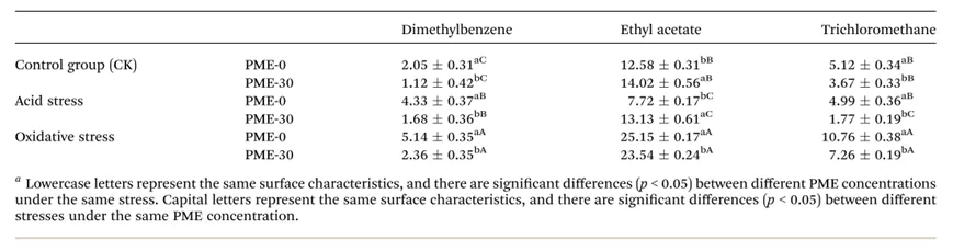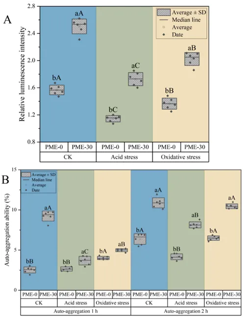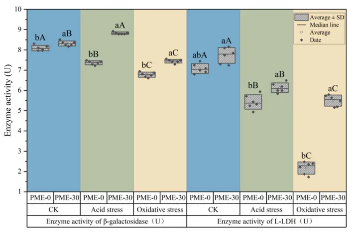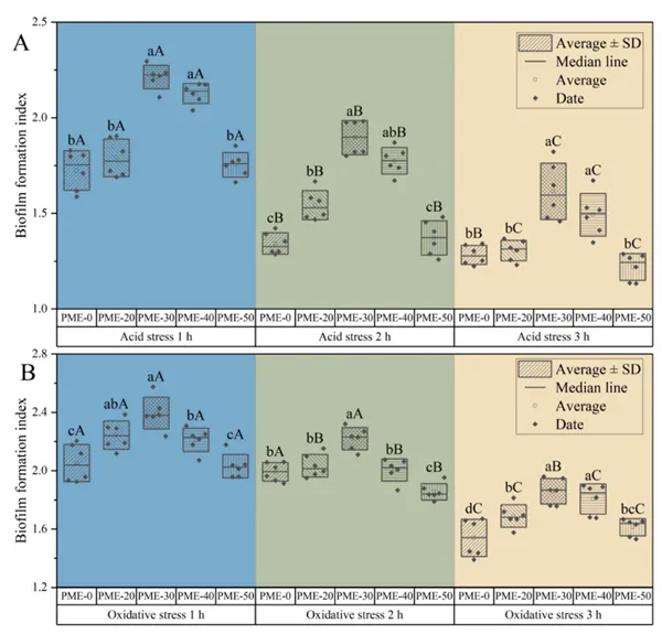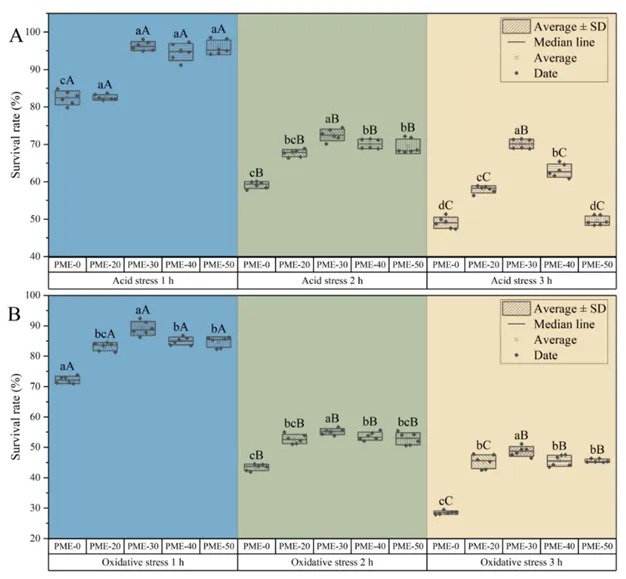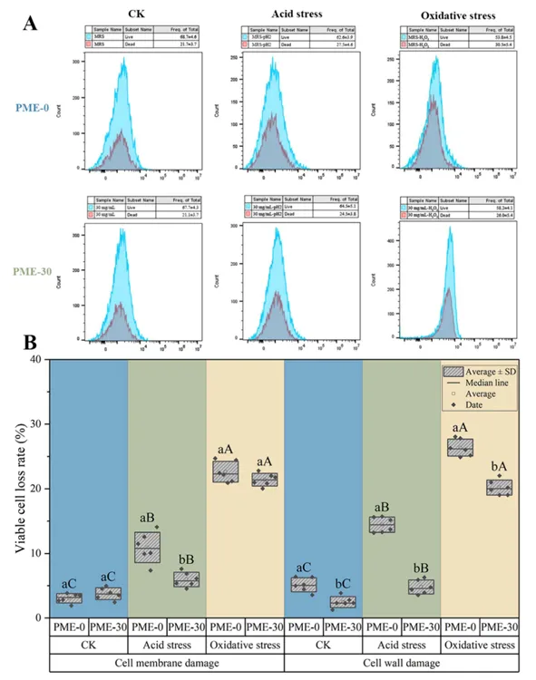 研究还发现,PME对酸胁迫的改善作用优于其对氧化胁迫的改善作用,提示其在低pH发酵食品(如泡菜、酸奶等)中具有更大的应用潜力。需要指出的是,本研究是在实验室模型体系中开展的。未来应进一步在真实食品发酵及贮藏条件下验证PME的保护效应,并考察其在更广泛益生菌种类中的适用性,以评估其普适应用潜力。此外,PME 的大规模提取及其工业化整合的经济可行性,也值得进一步系统研究。