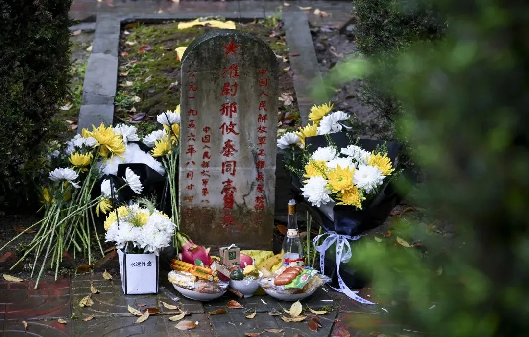 墓园之中松涛阵阵,“中国人民解放军工程兵学校学员准尉邢攸泰同志之墓”的碑文清晰醒目,静静诉说着那段峥嵘岁月。胡国培一行小心翼翼地擦拭墓碑,并将故乡的泥土撒在坟墓上,把祭品整齐摆放于碑前。“舅舅,介红和现峰带着咱老家的土,放在您的坟墓上,我们家人永远陪伴着您,不会忘记您,您放心。”胡国培对着墓碑,声音哽咽。