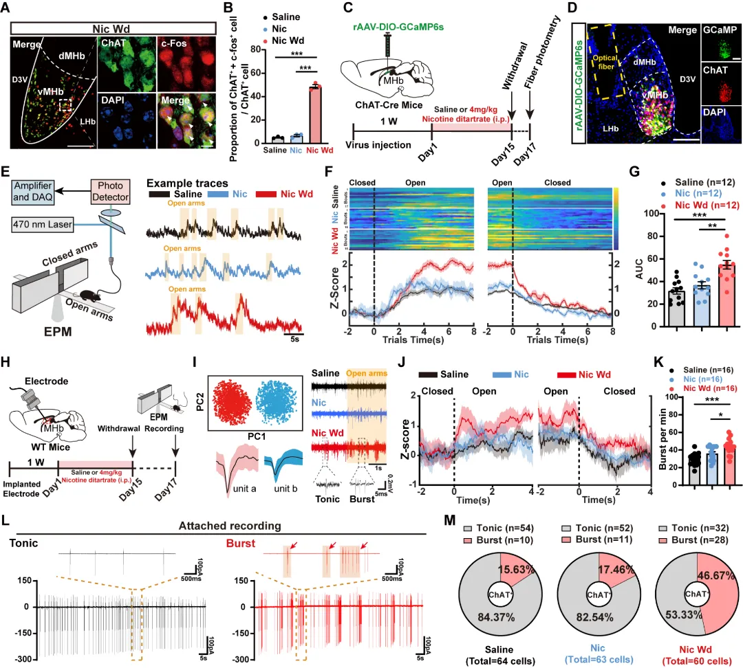 那么,这些神经元究竟是如何“编码”焦虑的?研究团队运用在体电生理与离体膜片钳技术,对神经元的放电模式进行了精细解析。结果发现,在生理状态下,vMHbChAT神经元呈现出一种稳定、规律的“强直放电”模式。然而,在焦虑状态下,这些神经元的放电模式发生了根本性的转变:原本规律的放电突然变得高频、爆发,形成了“簇状放电”。这种放电模式的变化,就像是舒缓的乐曲突然变成了激昂的鼓点,瞬间改变了整个系统的运作状态。vMHbChAT的特异性激活以及放电模式的转变提示该神经群体可能是编码焦虑情绪的关键神经电生理基础(图1)。图1. 焦虑状态诱导vMHbChAT神经元簇状放电增加