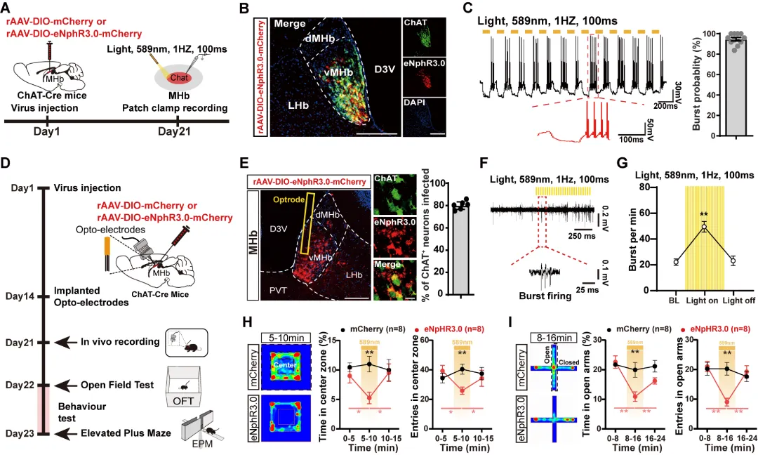 为验证放电模式转变是否直接驱动焦虑行为,研究人员采用光遗传学技术对vMHbChAT神经元活动进行精确调控。膜片钳全细胞记录结果显示,特定光刺激参数(589 nm,1Hz,100 ms脉冲)可稳定诱导vMHbChAT神经元产生簇状放电。在此基础上,结合在体电生理记录与行为学分析,研究人员利用该刺激模式对小鼠进行实时干预与监测。结果表明,仅通过人为诱导vMHbChAT神经元由强直放电向簇状放电的转变,就足以让原本平静的动物表现出明显的焦虑状态。这一结果直接证明,vMHbChAT神经元的放电模式的转变,就是焦虑情绪产生的直接驱动力(图2)。图2. 光遗传诱导vMHbChAT神经元burst放电引发焦虑样行为