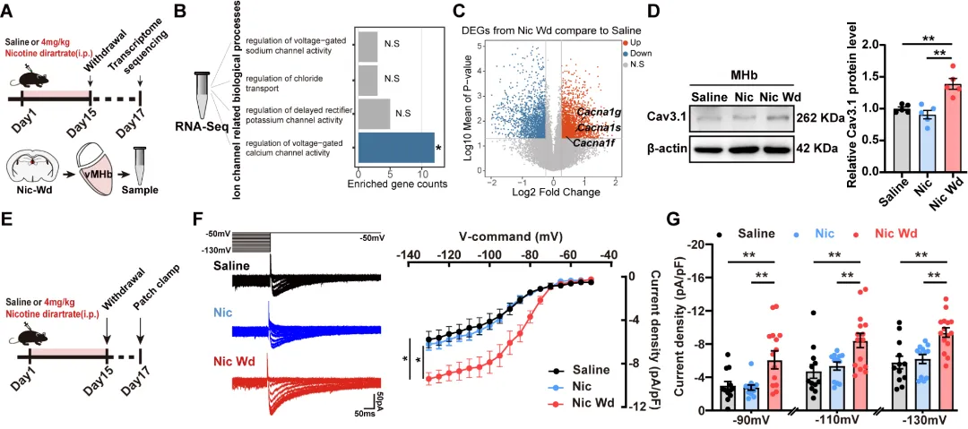 那么,是什么原因导致神经元的放电模式从“强直”转向“簇状”?研究团队进一步深入分子层面,结合转录组测序等技术,鉴定出簇状放电的关键的“调音”分子:T型钙通道Cav3.1。Cav3.1是一种位于神经元膜上的低电压门控钙通道,在节律性放电、反跳去极化以及爆发性放电的形成过程中发挥关键作用,因此被认为是调控神经元放电模式转换的重要离子通道基础。研究发现,在焦虑状态下,内侧缰核Cav3.1的蛋白表达显著上调;同时通过膜片钳记录T型钙电流发现vMHbChAT神经元T型钙电流增强,从而使神经元更容易进入“簇状放电”模式。上述结果表明,Cav3.1的异常上调可能是导致簇状放电增加的关键机制之一(图3)。图3. 焦虑状态下vMHbChAT神经元中Cav3.1表达增加
