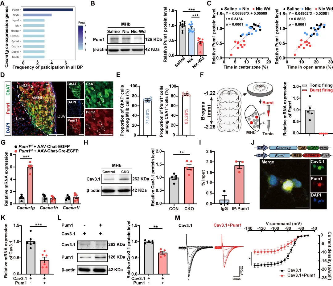 进一步的转录组学分析提示,另一个关键“调音”分子Pum1可能参与调控Cav3.1介导的焦虑相关过程。Pum1是一种RNA结合蛋白,可通过结合靶mRNA并促进其降解,从而在基因表达层面发挥“刹车”样调控作用。研究发现,内侧缰核中Pum1的表达水平与焦虑状态呈显著负相关;同时,单细胞RT-qPCR结果进一步显示,在表现为簇状放电的神经元中,Pum1表达显著降低。机制研究进一步表明,Pum1可直接结合Cav3.1的mRNA并促进其降解,从而抑制Cav3.1蛋白的表达及功能。上述结果共同提示,在焦虑状态下,Pum1表达下降可能解除其对Cav3.1通路的抑制作用,进而导致Cav3.1功能增强,从而推动神经元放电模式向簇状放电转变(图4)。图4. Pum1通过结合并促进Cav3.1 mRNA降解,从而抑制其表达
