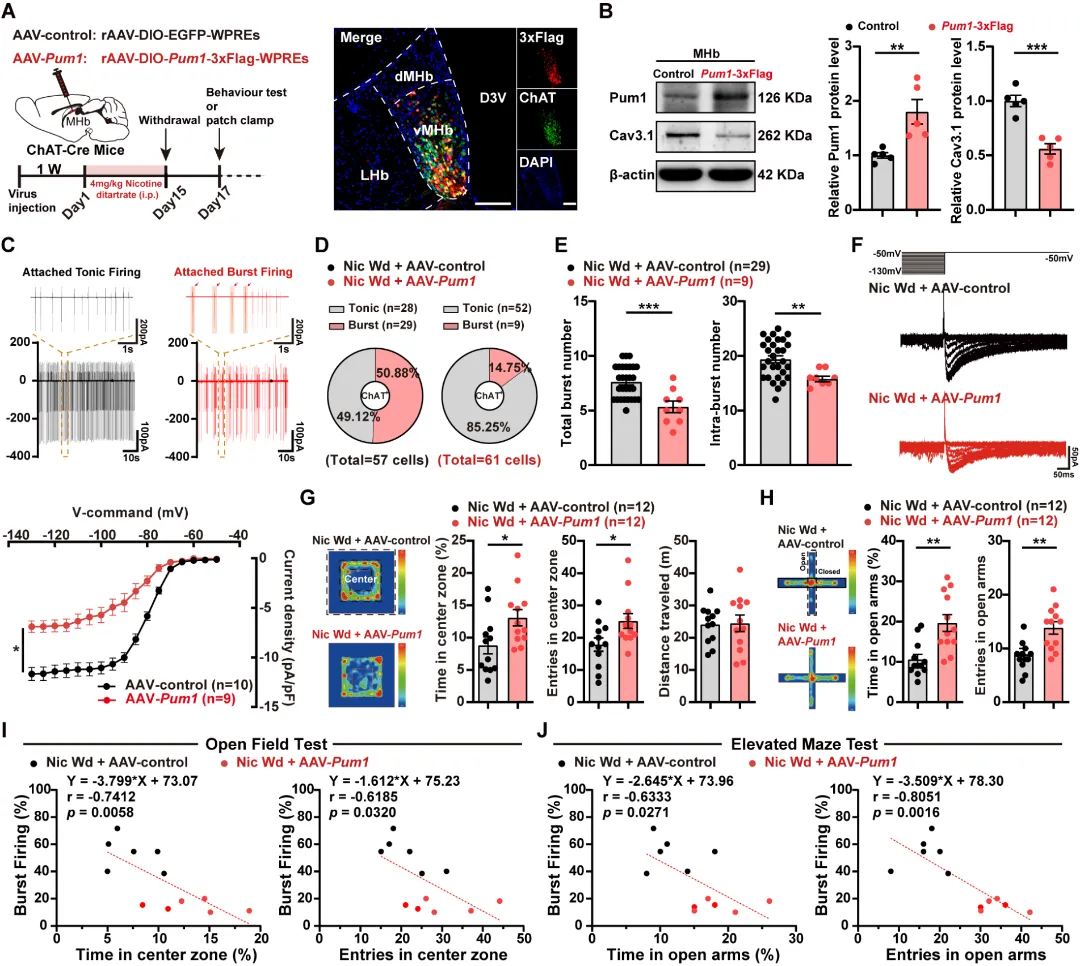 进一步为验证其行为学效应,研究人员在vMHbChAT神经元中过表达Pum1,发现Cav3.1的表达水平被成功降低并抑制了焦虑状态下异常升高的T型钙通道电流。膜片钳记录发现神经元簇状放电比例显著降低至生理水平,同时焦虑行为也得到了显著缓解。这一系列实验清晰地勾勒出一条从分子-离子通道-神经元放电模式-行为表型的纵向调控逻辑链条:Pum1 → Cav3.1 →神经元放电模式→ 焦虑行为,为理解焦虑障碍的分子基础提供了完整机制框架(图5)。图5. vMHbChAT神经元特异性过表达Pum1挽救焦虑样行为