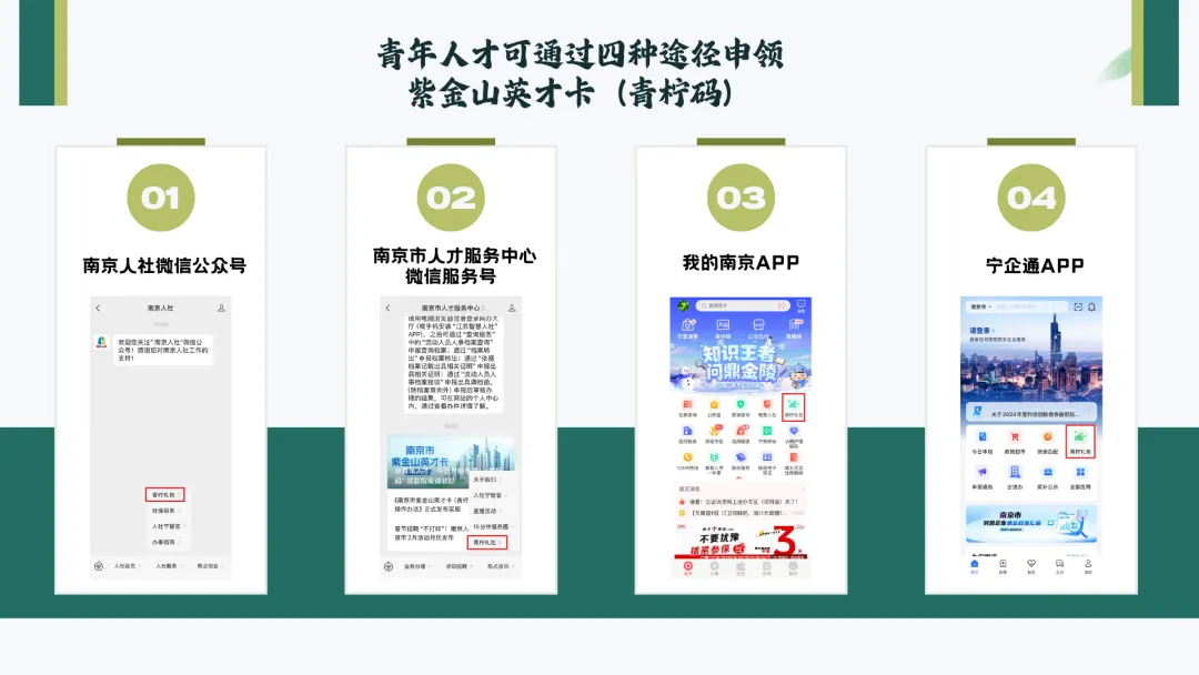 青年人才可通过“南京人社”微信公众号、“南京市人才服务中心”微信服务号以及“我的南京”App、“宁企通”App,进入青柠码申领专区进行申领。