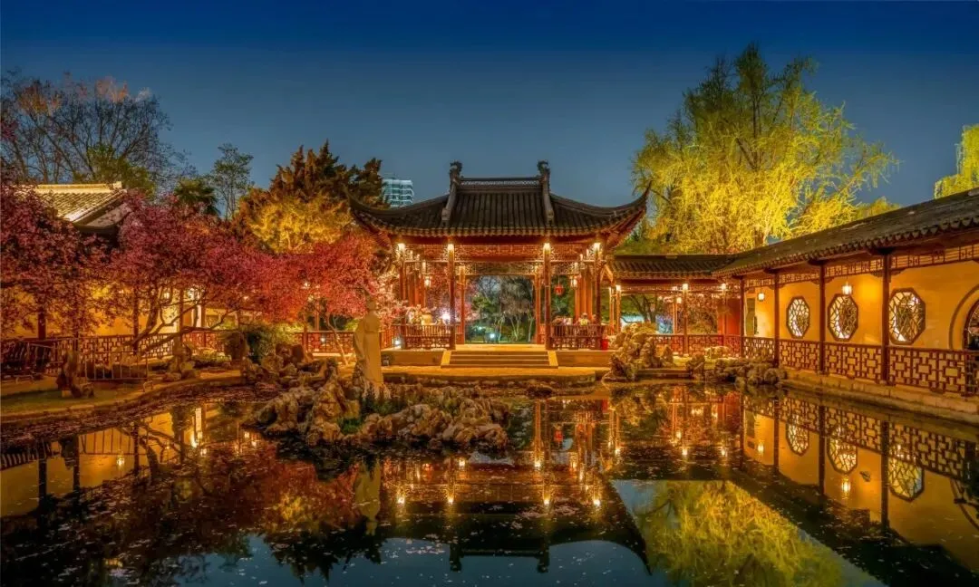 没有白天的人潮拥挤,只有海棠、灯光、湖水相伴,这份独有的静谧与浪漫,是白天的莫愁湖给不了的。