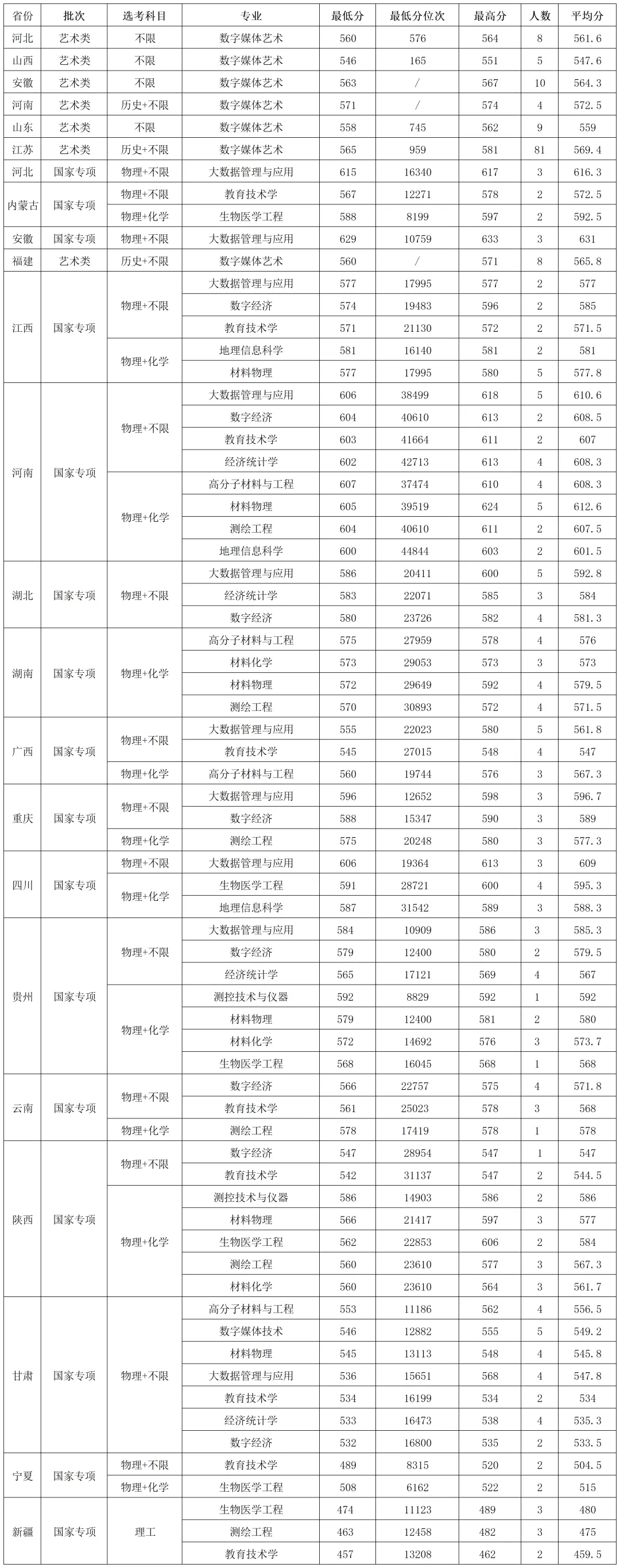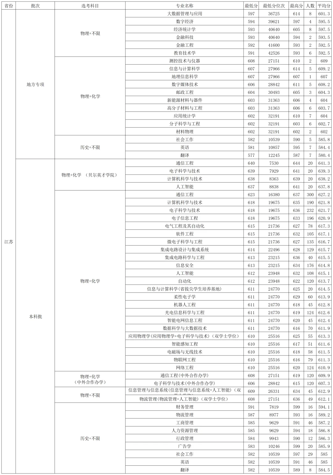 南京邮电大学2025年艺术、国家专项在各省各专业 录取分数线