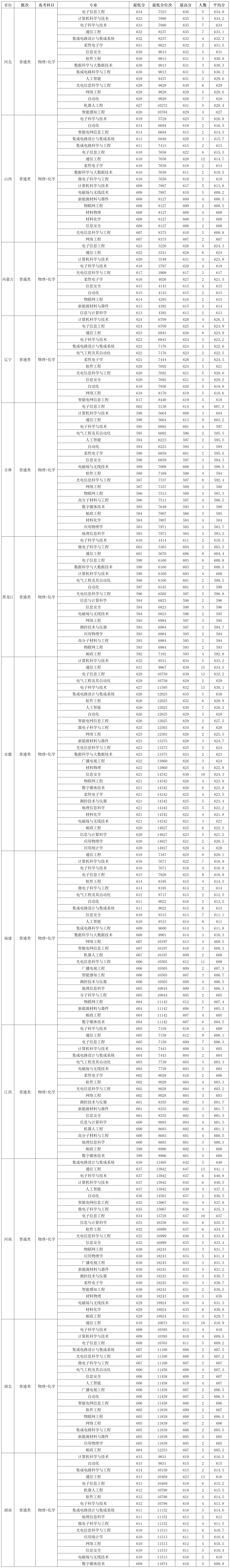 南京邮电大学2025年在河北本科批(物理+化学)录取分数线高的专业 :电子信息工程634分、计算机科学与技术633分、电子科学与技术633分、通信工程632分、集成电路设计与集成系统632分,最低的是智能感知工程626分,最低分位次10704。