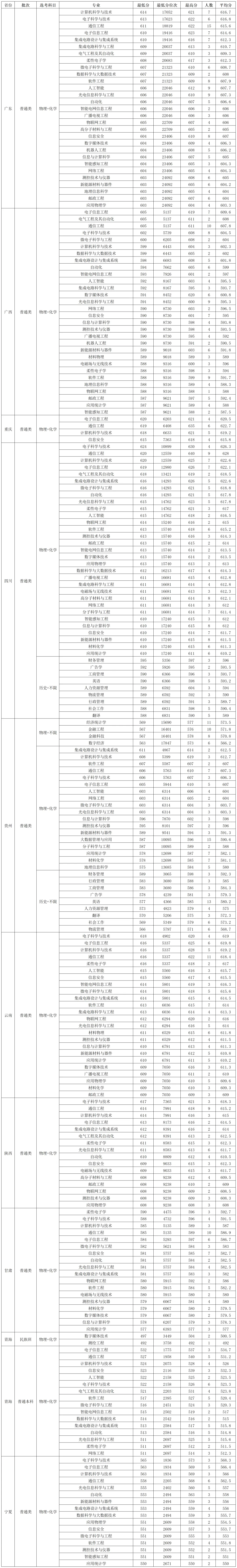 南京邮电大学2025年在广东本科批(物理+化学)录取分数线高的专业 :计算机科学与技术614分、电子科学与技术613分、通信工程611分、 电子信息工程610分、 集成电路设计与集成系统610分,最低603分,最低分位次24092.