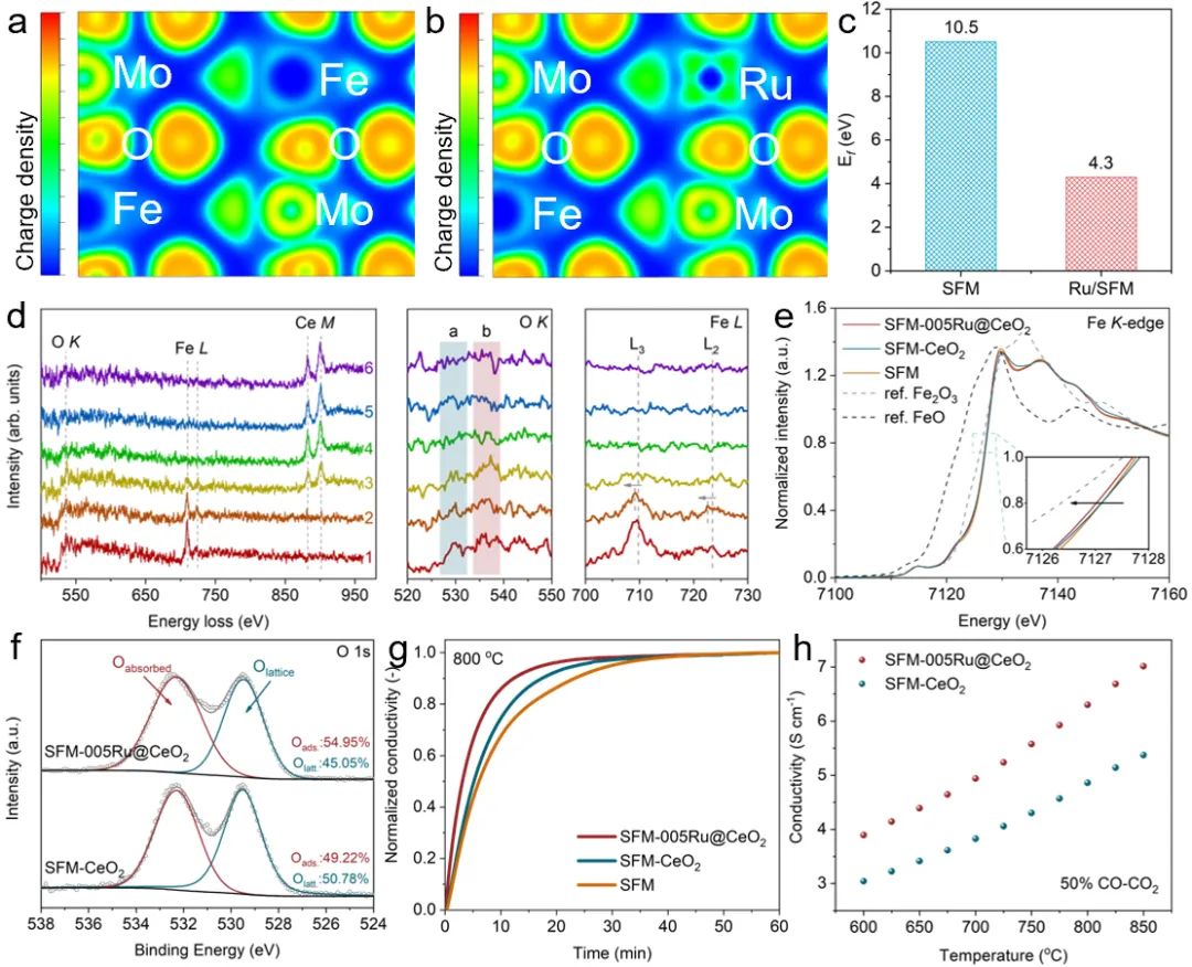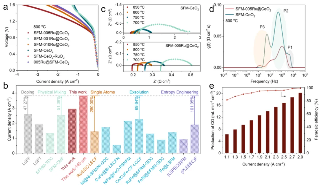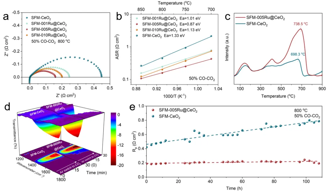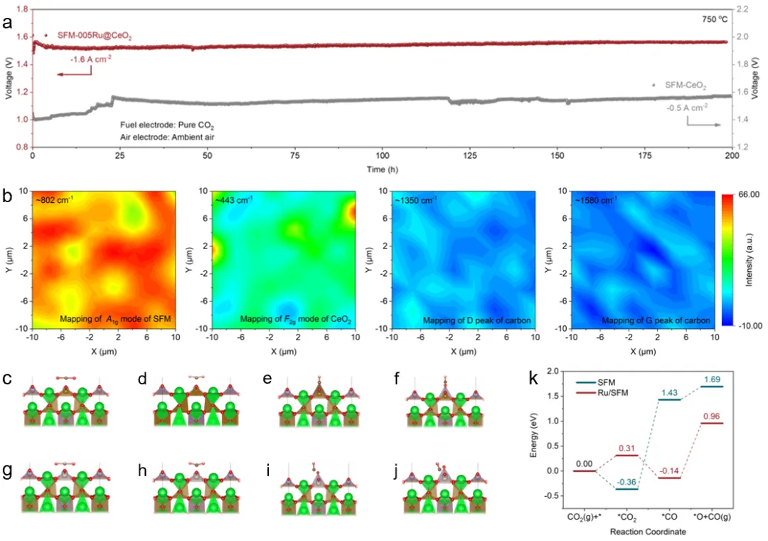 总之,本研究填补了固体氧化物电解池复合电极异质界面优化的技术空白。具体而言,通过对SFM-005Ru@CeO₂复合材料进行高温煅烧,并利用高温下氧化铈对钌的有限固溶特性,实现了对SFM-005Ru@CeO₂的定向异质界面优化。密度泛函理论计算、电子能量损失谱和X射线吸收谱分析表明,通过钌的定向迁移实现的异质界面精确优化,显著增加了界面氧空位浓度并提升了电子传导性,从而有效提高了复合电极的二氧化碳还原反应活性。在直接二氧化碳电解测试中,采用SFM-005Ru@CeO₂阴极的单电池在800°C、1.5V条件下实现了高达2.94 A·cm⁻²的电流密度,远超相同条件下SFM-CeO₂电极的1.10 A·cm⁻²。此外,由于钌的定向迁移旨在实现异质界面的精确优化,SFM-005Ru@CeO₂基底的结构稳定性得到良好保持,确保了其在高电流条件下(750°C,1.6 A·cm⁻²)连续运行200小时的耐久性。本工作提出了一种精确优化异质界面的新策略,可有效最大化异质界面的催化活性,为复合材料中异质界面的进一步发展开辟了新途径。