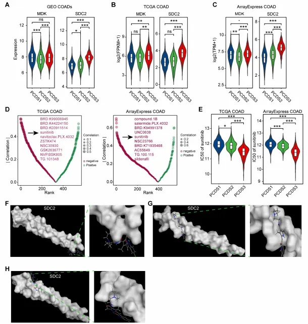 4.明确靶向药物:经药物重定位和分子对接验证,证实舒尼替尼可高亲和力结合SDC2,为PCDS3亚型患者提供潜在靶向治疗方案。