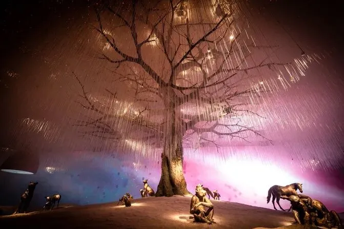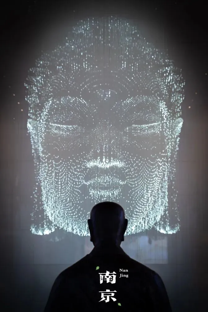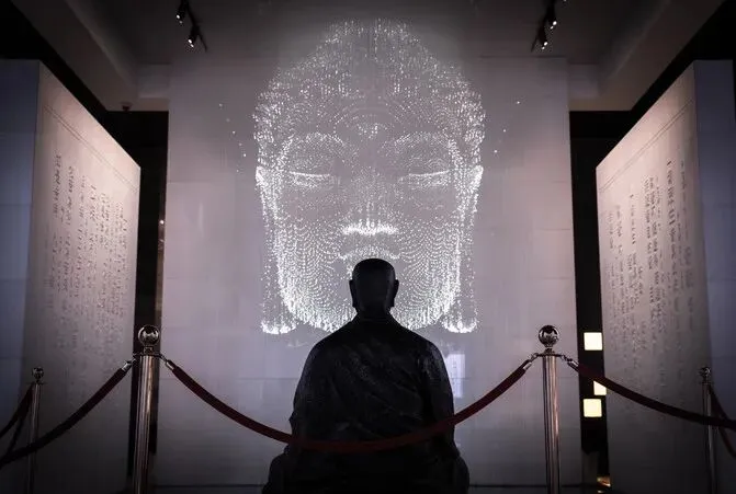 由光纤和8000多个水晶珠子组成的3D立体佛首前,一尊铜质的玄奘坐像面朝佛首静思,形成了与佛祖凝神对视的场景。这个展厅叫“千年对望”,展厅两旁共八根琉璃立柱,寓意释迦牟尼佛八相成道。步道上设有七朵莲花的感应屏,跟随着人的脚步莲花朵朵开放,寓意佛陀“七步生莲”。