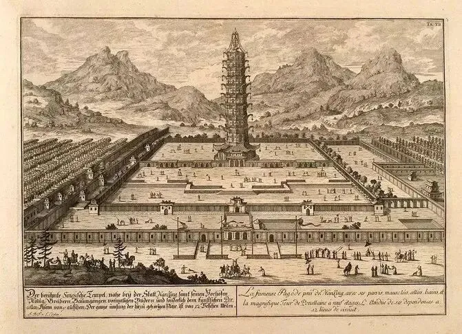 这个宝塔的形象并非虚构,它的原型很可能就是曾经矗立在秦淮河边的南京大报恩寺琉璃塔。曾几何时,这座琉璃塔与罗马大斗兽场、比萨斜塔、中国万里长城等一道被称为中世纪世界七大奇迹,并被西方人视为中国的标志性符号。1655年,荷兰东印度公司使团来到南京,随团的画师尼霍夫绘制了多幅琉璃塔的写生作品,后来以铜版画的形式在欧洲出版,迅速掀起了“南京瓷塔热”。这座足可以代表中国的瓷塔,在欧洲家喻户晓,以至于从没来过中国的安徒生,将其写进了童话《天国花园》之中。只是,琉璃塔在中国人的视线中已经消失得太久,以至于它在国内反倒不是那么知名。这座塔毁于太平天国末期,此后许多年,国人才从外国人崇拜的语气中,片段式地读到了它曾经辉煌的过去。