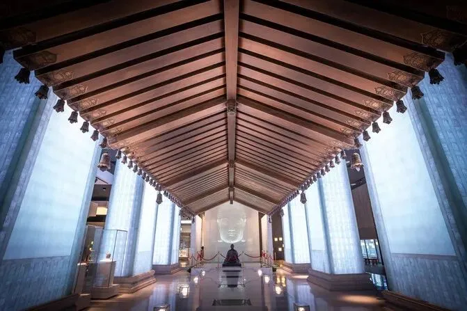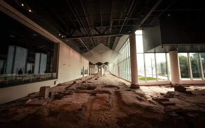 走进展馆,首先映入眼帘的就是大片的遗址现场。为了保护地下的遗址,无法大兴土木再建寺庙,而这遗址上一排排屋檐立柱的造型,构建出了一座座无形的寺庙。馆内大面积地运用了玻璃,不仅让场馆更加通透,也尽可能地为我们展现了遗址原貌。