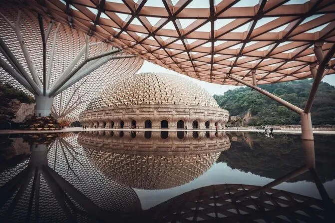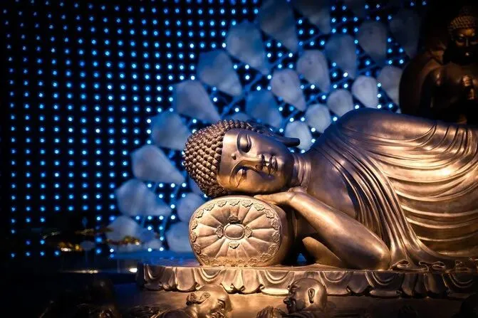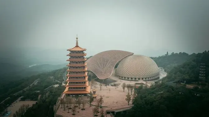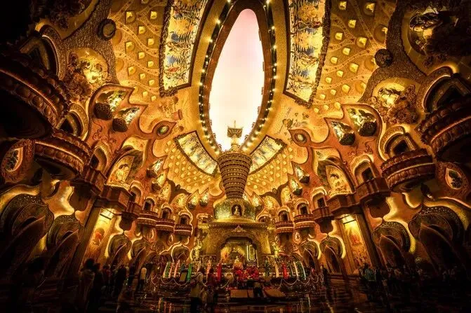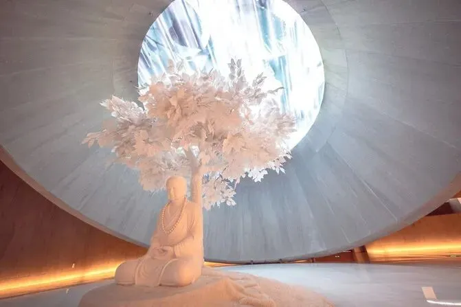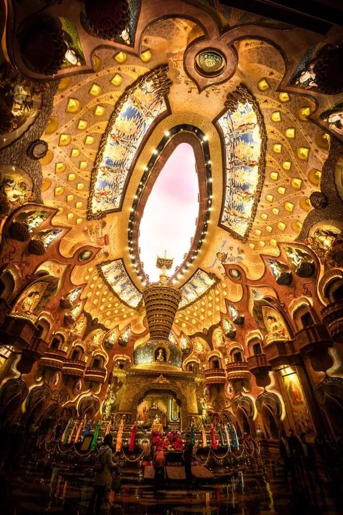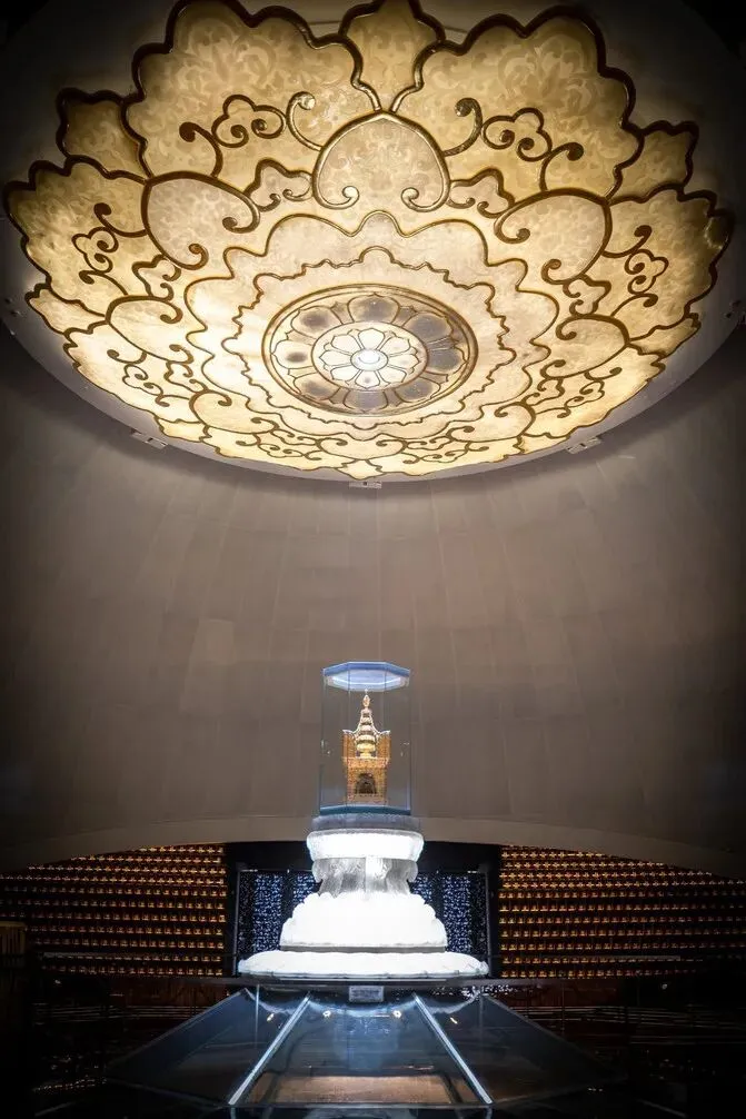 外表耀眼的佛顶宫,重重叠叠的金色花纹,组成巨大穹顶,像鸟巢一样,盖在灰色墙上,颇有幻境之感,除了感受建筑的精巧、震撼外,还能欣赏到一大批精美绝伦的顶级艺术珍品,这些艺术珍品由全国100多位工艺美术大师、专家、学者、非遗传承人携手创作,每一件都为佛顶宫量身打造。