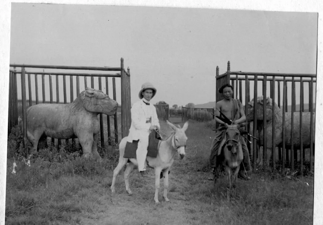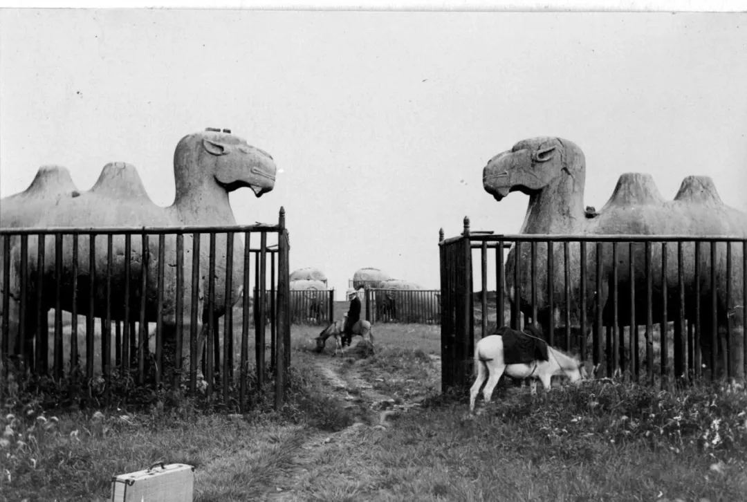 图里最扎眼的这俩庞然大物,叫石骆驼,明孝陵神道上的石像生家族成员,别看外头一圈铁栏像个围栏,那可是清末端方大人特意围上的,怕这批古兽被人刮蹭,算半个保护罩。一对一排,抬头挺胸,凸出两个驼峰,呆呆杵着,塌鼻短尾,石头纹里还能见缀着雨迹灰尘,站路边几百年一动不动。