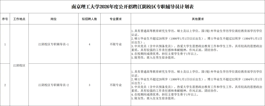 5.满足应聘岗位其他要求,详见《南京理工大学2026年度公开招聘江阴校区专职辅导员计划表》。