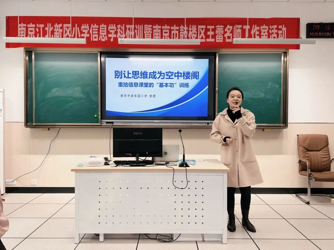 活动中,来自南京市芳草园小学分校姜家园小学的郭蓉老师带来了题为《别让思维成为空中楼阁:重拾信息课堂的“基本功”训练》的专题讲座,从实践层面阐述了夯实课堂基础的重要性。南京江北新区浦洲路小学的葛安琪老师则分享了青年教师专业成长的经验与心得。