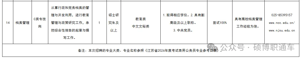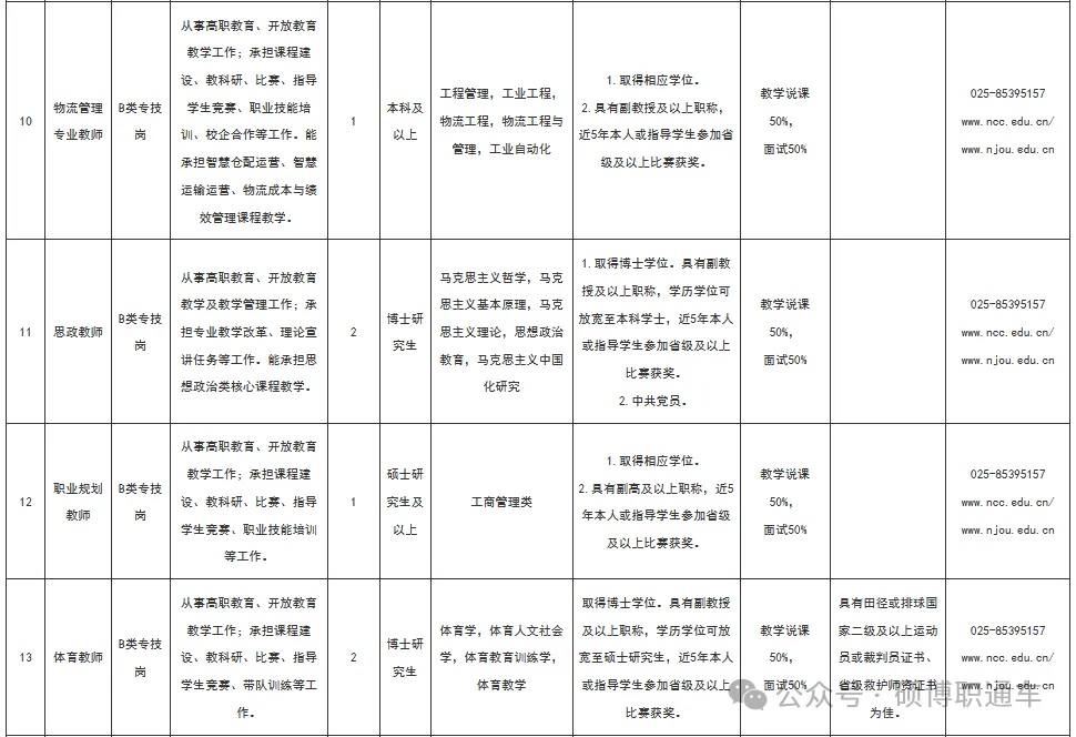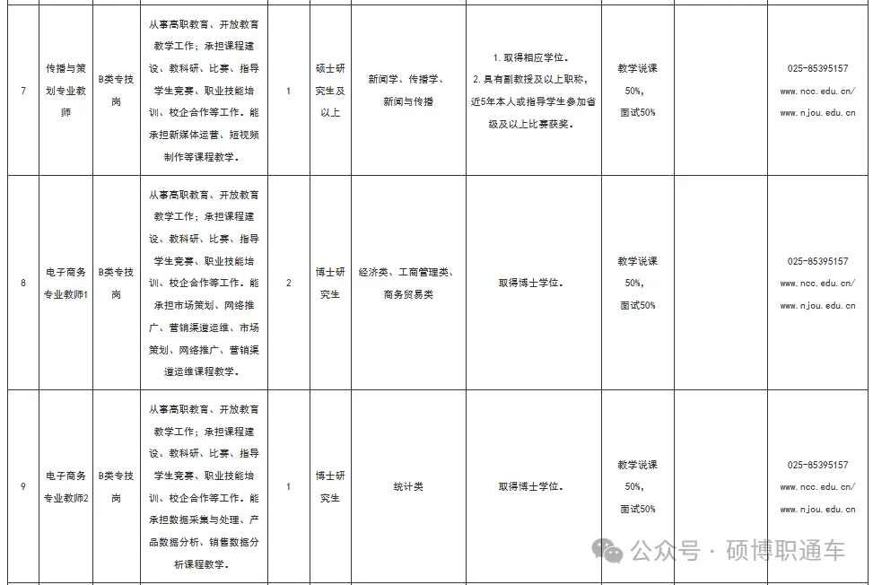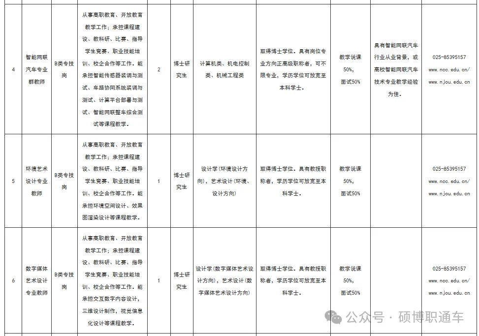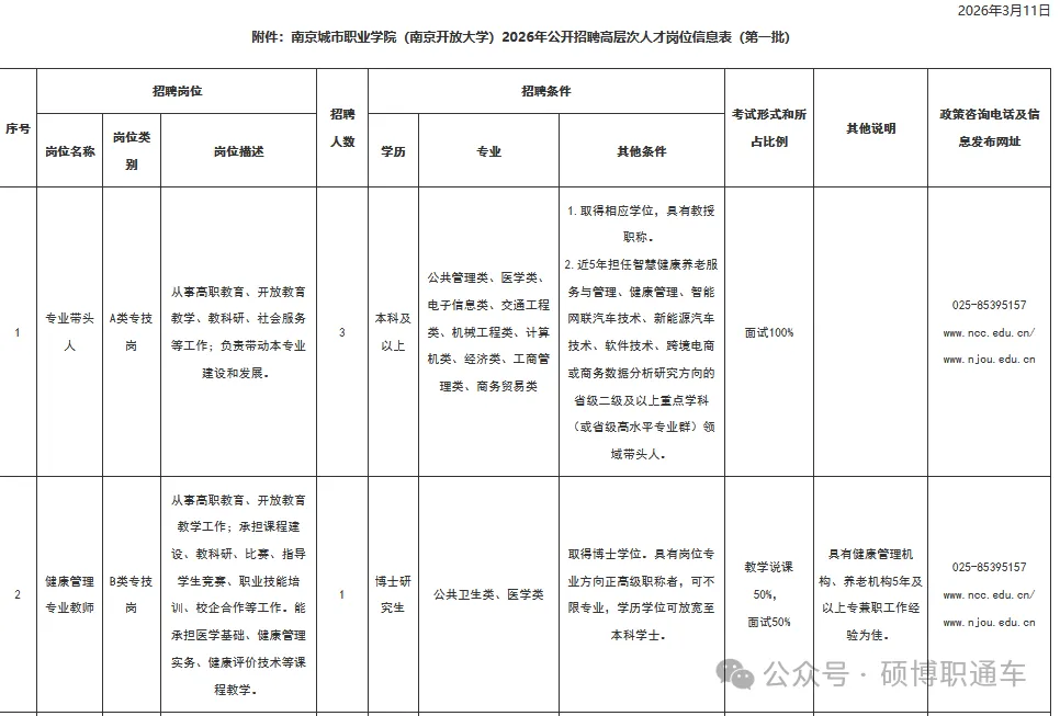 本次招聘相关信息在南京市人力资源和社会保障局网站(http://rsj.nanjing.gov.cn)、南京城市职业学院网站(http://www.ncc.edu.cn)和南京开放大学网站(http://www.njou.edu.cn)发布,具体的招聘岗位、数量、资格条件等详见附件1《南京城市职业学院(南京开放大学)2026年公开招聘高层次人才岗位信息表(第一批)》(以下简称《岗位信息表(第一批)》)。