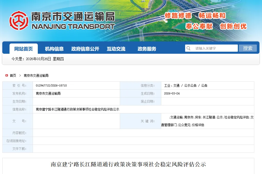 近日,南京交通运输局发布了《南京建宁路长江隧道通行政策决策事项社会稳定风险评估公示》,就拟定的通行政策向社会各界征求意见和建议,公示时间为2026年3月24日至2026年4月7日。