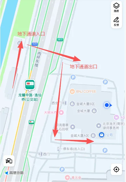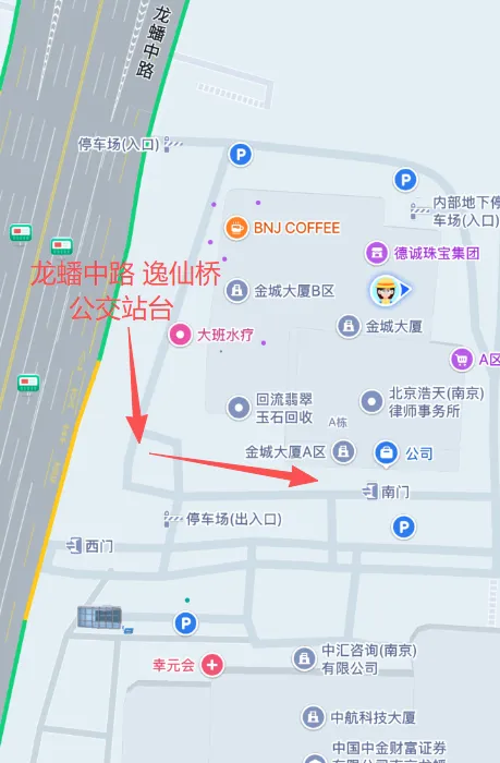 若乘坐公交车前往瑞金路(南)方向,在龙蟠中路·逸仙桥站下车,往回走约 30 米,通过地下过街通道,在出口处向左转,经过金城大厦 B 区后再向左转,到达金城大厦 A 区正门。