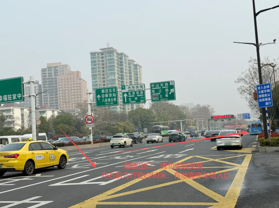 温馨提示:若从隧道口驶出,请勿进行实线变道,请在前方虚线处右转进入地面停车场。