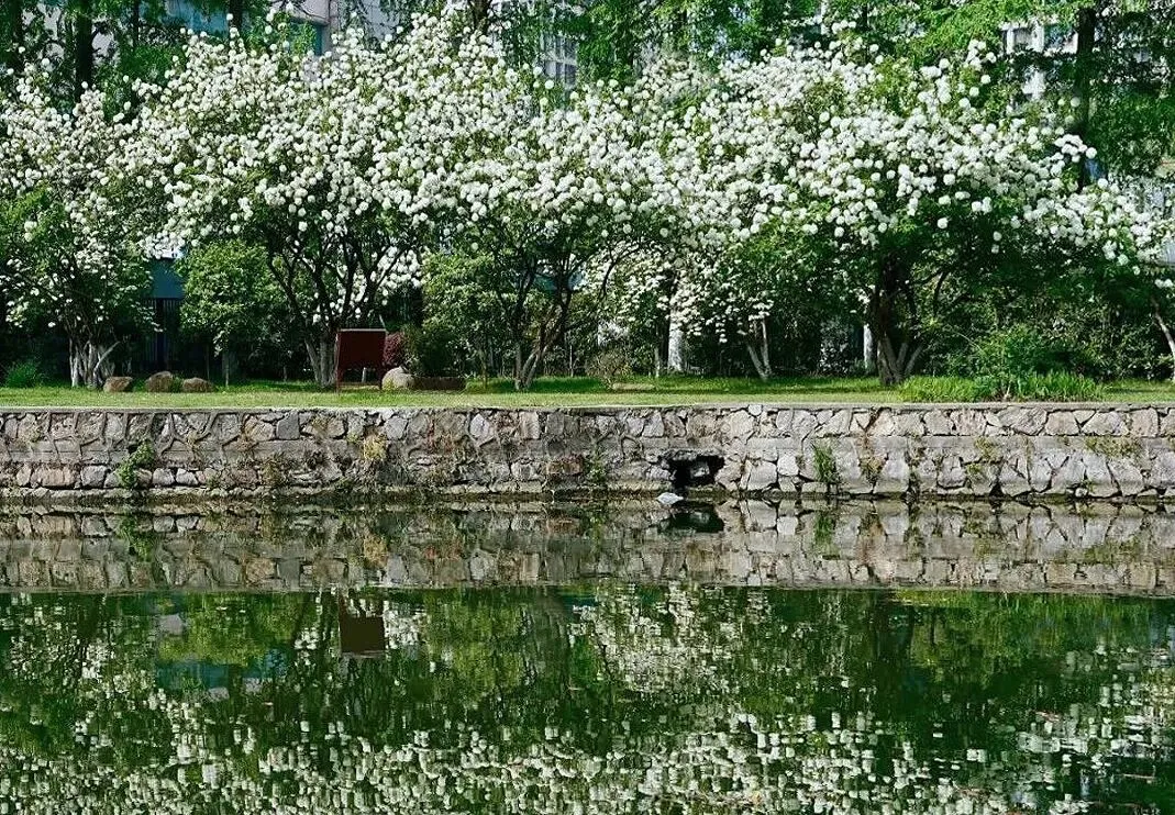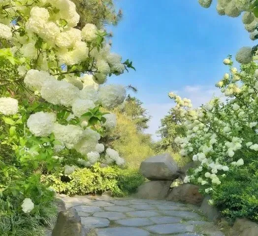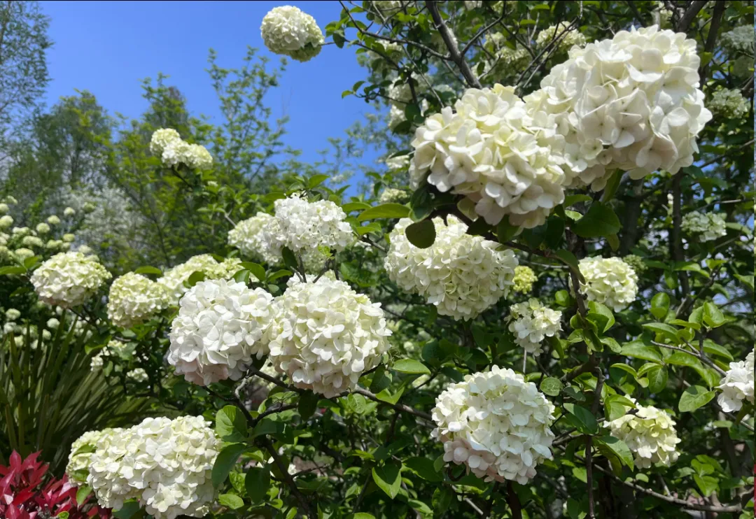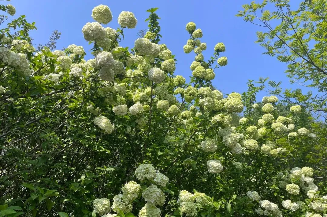 位于愚园无隐精舍前,孤株木绣球倚假山、临白墙,体量不大但格外雅致。满树雪球映着黛瓦粉墙与愚湖波光,人少景静,花影入窗,衬着江南庭院的清幽。西门有一排较大的木绣球,位于水岸和步道边,背后是高大的水杉背景,衬托白色花团刚好;树形饱满,花量密集,人少好拍照。翠洲有几株小株木绣球,临绿岛、配湖景,拍照很出片;樱洲疏植几株,花影映水,和樱花林相映成趣;月季园旁有一株株型饱满,满树繁花;均是拍照打卡的好去处,人不多。十几株木绣球形成连续密集的白色花带,比起网红打卡地,这里人少景美,更安静,有时间、空间慢慢拍,还可以顺带沿着长江生态带休闲游览。主要集中在登基山的观景步道旁;它们生长在登基山的石径旁,与翠绿的松柏相映成趣,纯白色的木绣球窗台很是出片。