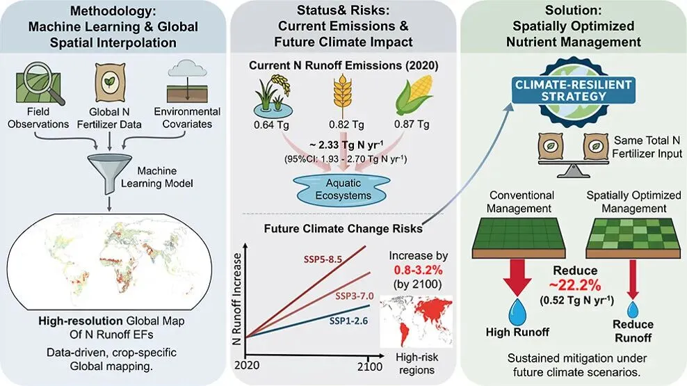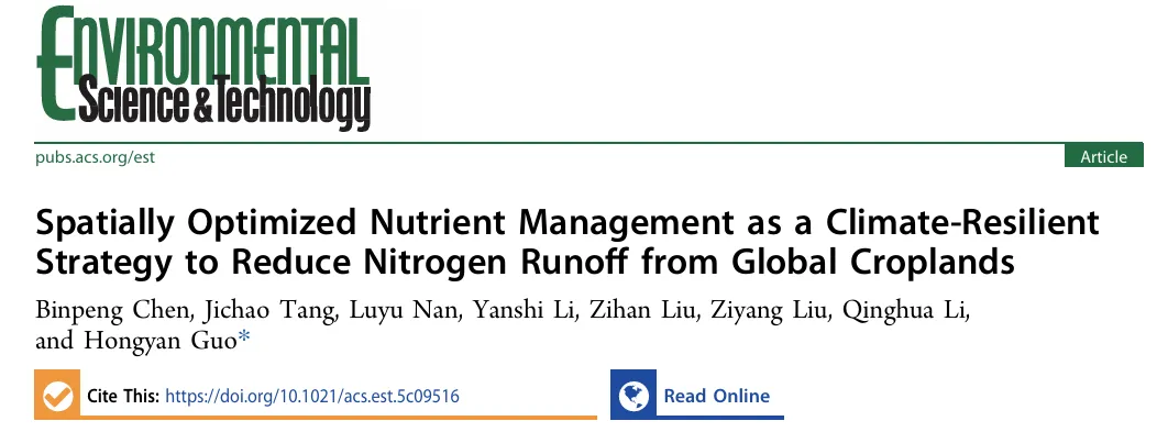 Chen, B., Tang, J., Nan, L., Li, Y., Liu, Z., Liu, Z., Li, Q., & Guo, H. (2025). Spatially Optimized Nutrient Management as a Climate-Resilient Strategy to Reduce Nitrogen Runoff from Global Croplands. Environmental Science & Technology. https://doi.org/10.1021/acs.est.5c09516