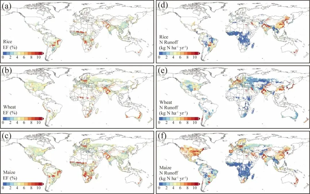 2020年全球农田氮径流现状:2020年,全球由合成氮肥施用导致的水稻、小麦和玉米田氮径流总量为2.33 Tg N yr⁻¹,其中玉米贡献最大(37%),小麦次之(35%),水稻居后。空间分布上,亚洲是最大的排放区域,中国、印度和美国是前三大排放国。高排放强度区域呈现明显的地理聚集:水稻主要集中在中国东部、印度北部、巴基斯坦东部等地;小麦主要分布在华北平原、印度北部、欧洲中西部等地;玉米则集中于美国中西部、中国华北平原和东北地区等地。
