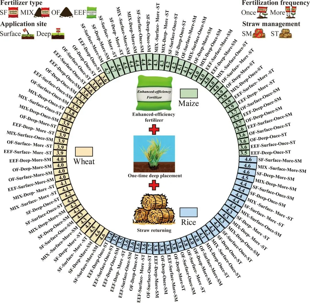 全球氮径流排放因子及其对管理的响应:2020年,在传统合成氮肥管理下,全球水稻、小麦和玉米的氮径流排放因子范围分别在1.0%-12.1%、0.8%-11.5%和0.7%-11.9%之间。不同的养分管理措施对排放因子有显著影响。在所有作物中,“合成氮肥-表施-多次施用-秸秆移除”的组合导致了最高的平均排放因子(4.6%-4.7%)。相比之下,“增效肥料-深施-一次施用-秸秆还田”的组合在全球范围内平均排放因子最低(3.4%-3.6%),显示出最大的减排潜力。